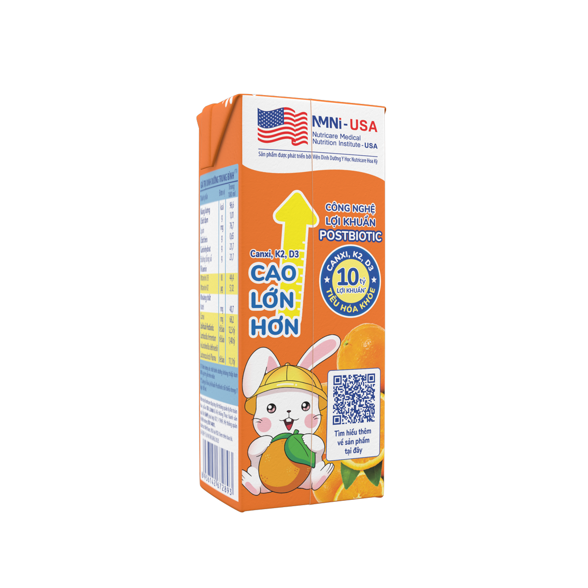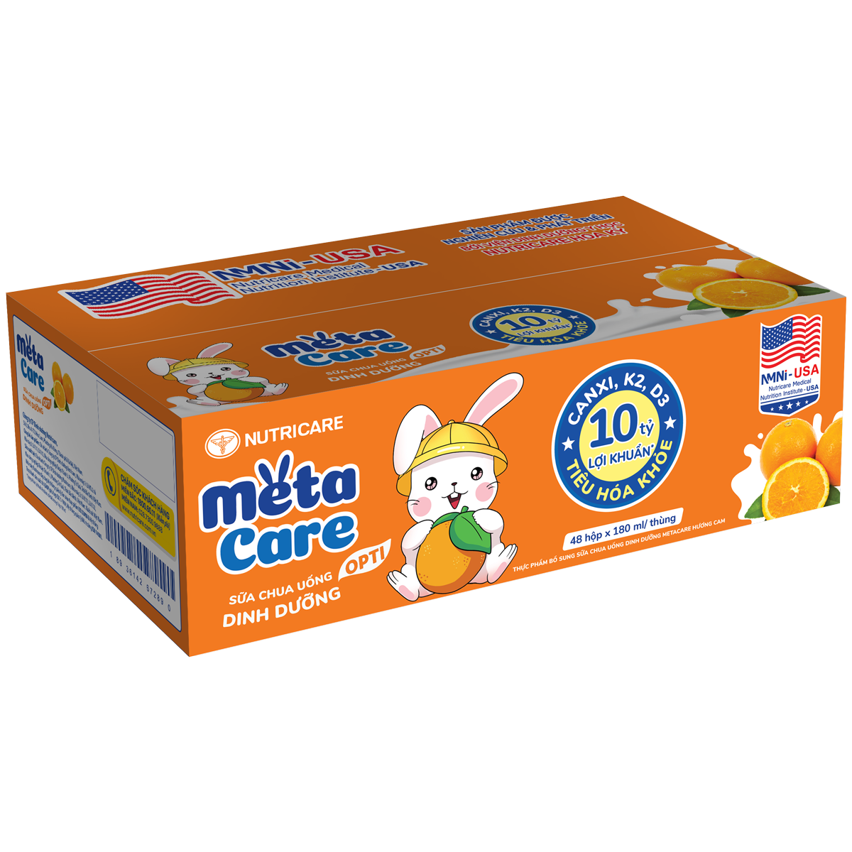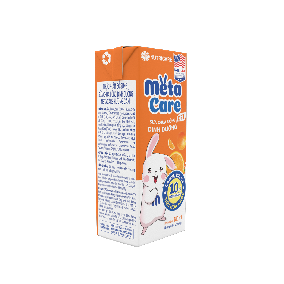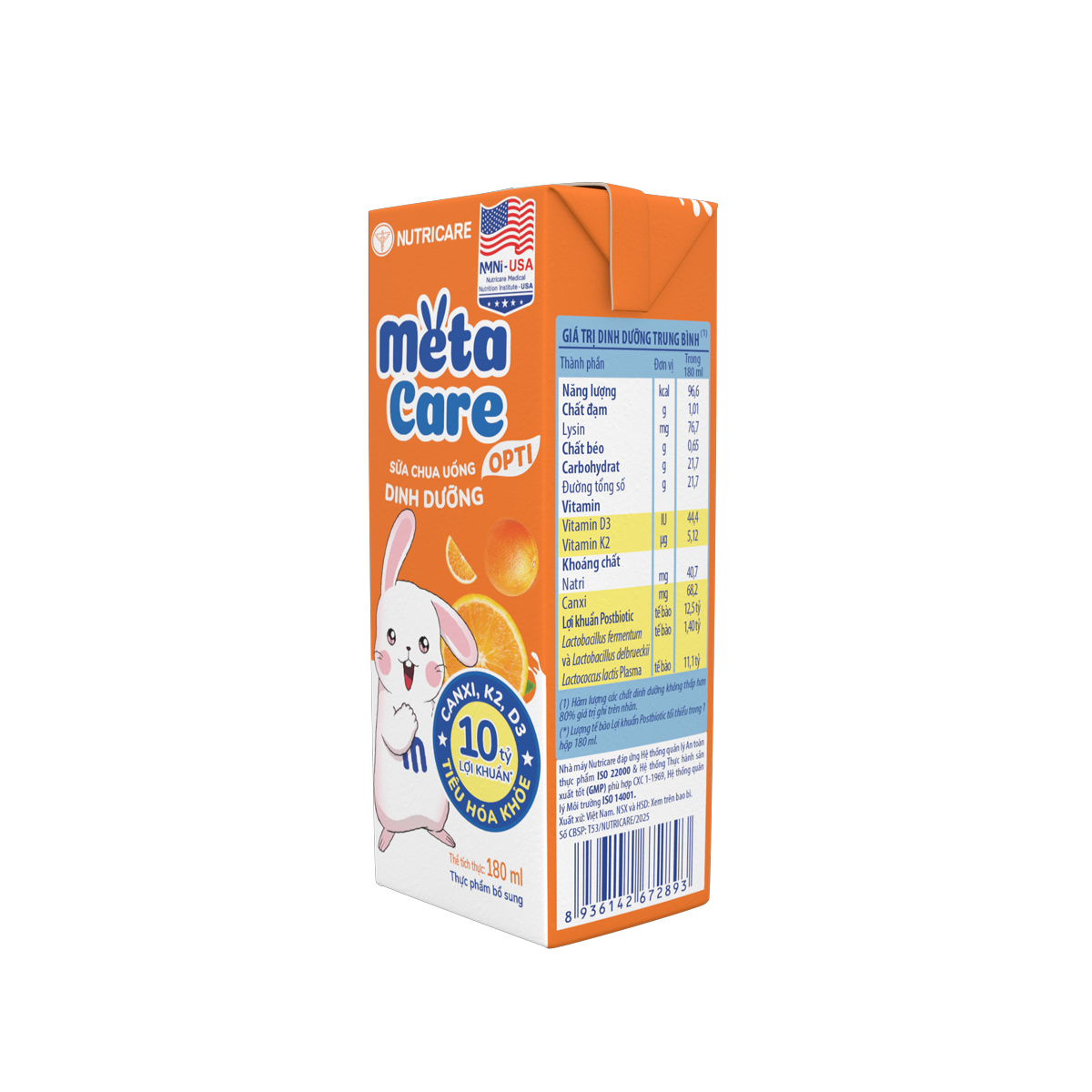 Sữa chua uống dinh dưỡng Metacare được phát triển bởi Viện Dinh dưỡng Y học Nutricare Hoa kỳ đột phá công nghệ Lợi khuẩn Postbiotic với 10 tỷ lợi khuẩn(*) cùng Canxi, K2, D3 giúp bé tiêu hóa khỏe, cao lớn hơn. 3 vị trái cây tự nhiên Cam, Dâu, Nho, bé thỏa sức khám phá và thưởng thức mỗi ngày.