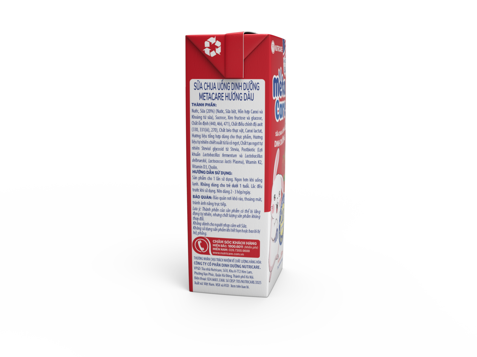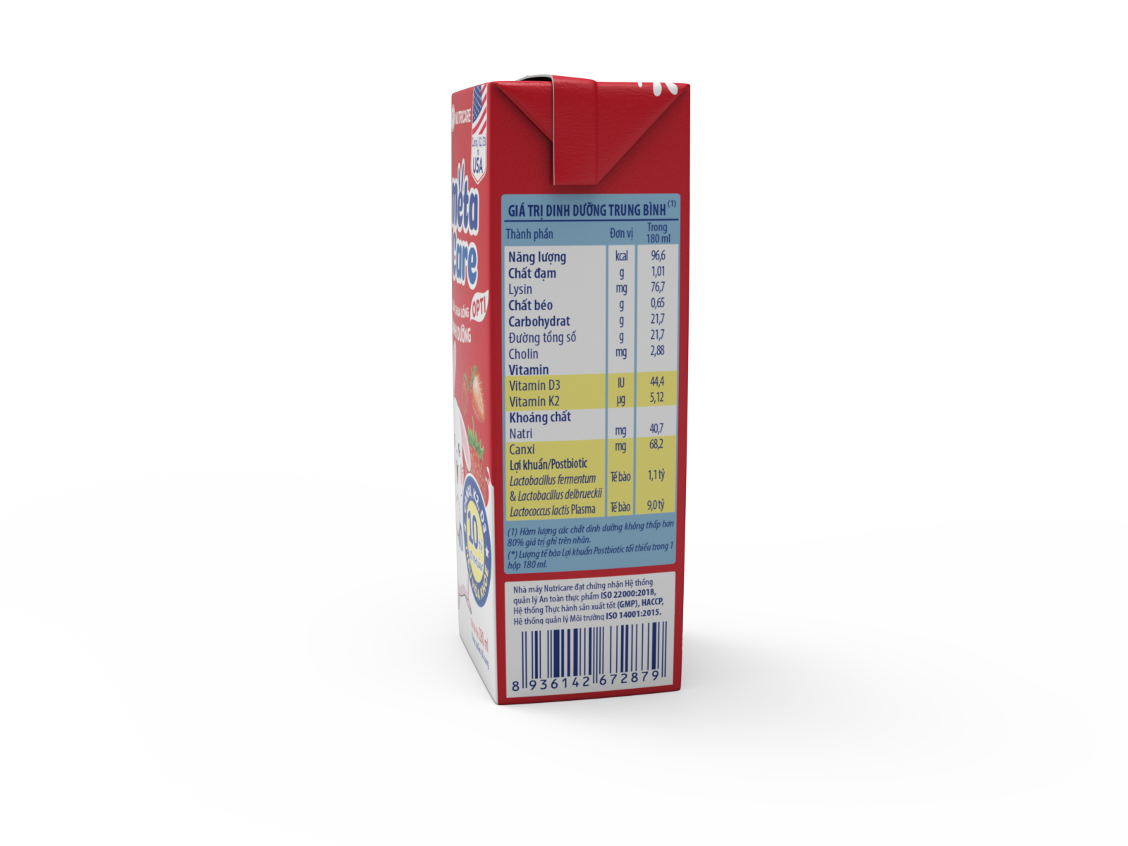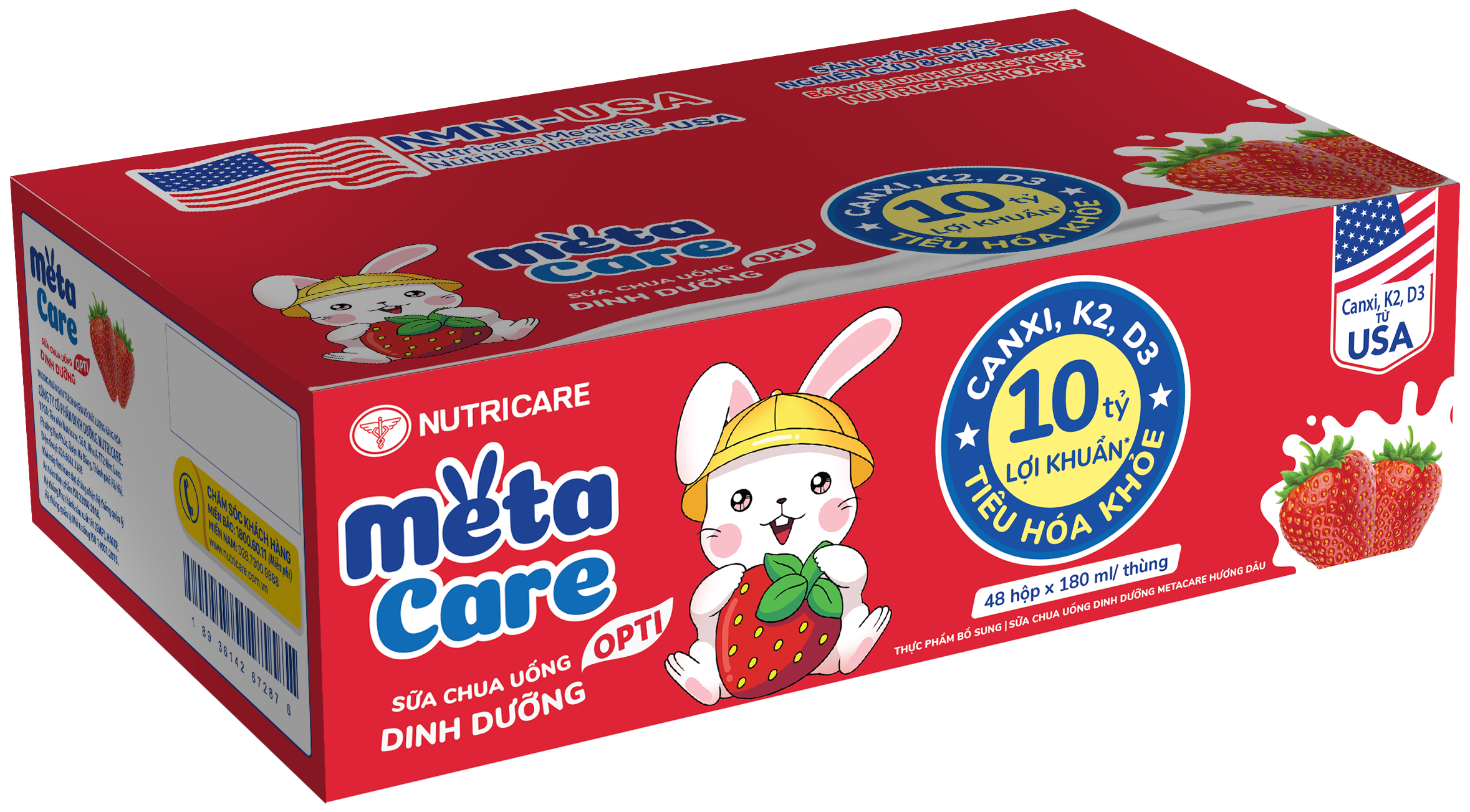 Sữa chua uống dinh dưỡng Metacare được phát triển bởi Viện Dinh dưỡng Y học Nutricare Hoa kỳ đột phá công nghệ Lợi khuẩn Postbiotic với 10 tỷ lợi khuẩn(*) cùng Canxi, K2, D3 giúp bé tiêu hóa khỏe, cao lớn hơn. 3 vị trái cây tự nhiên Cam, Dâu, Nho, bé thỏa sức khám phá và thưởng thức mỗi ngày.