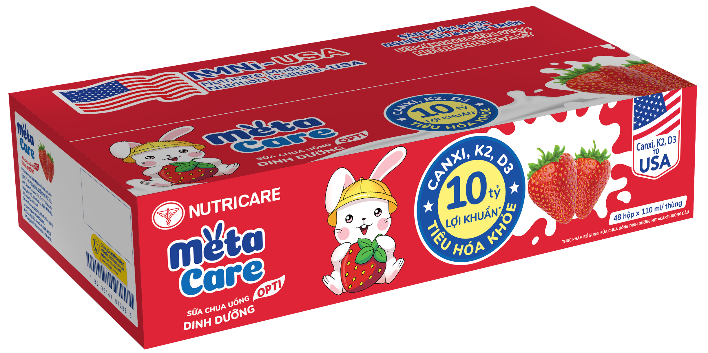 Sữa chua uống dinh dưỡng Metacare được phát triển bởi Viện Dinh dưỡng Y học Nutricare Hoa kỳ đột phá công nghệ Lợi khuẩn Postbiotic với 10 tỷ lợi khuẩn(*) cùng Canxi, K2, D3 giúp bé tiêu hóa khỏe, cao lớn hơn. 3 vị trái cây tự nhiên Cam, Dâu, Nho, bé thỏa sức khám phá và thưởng thức mỗi ngày.