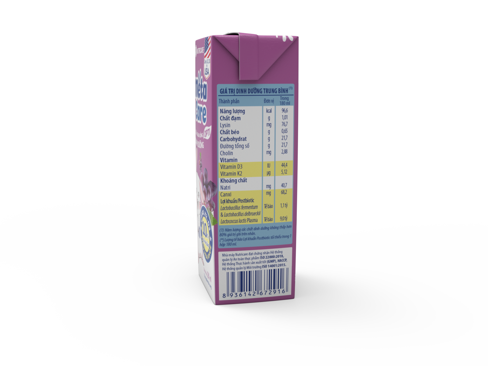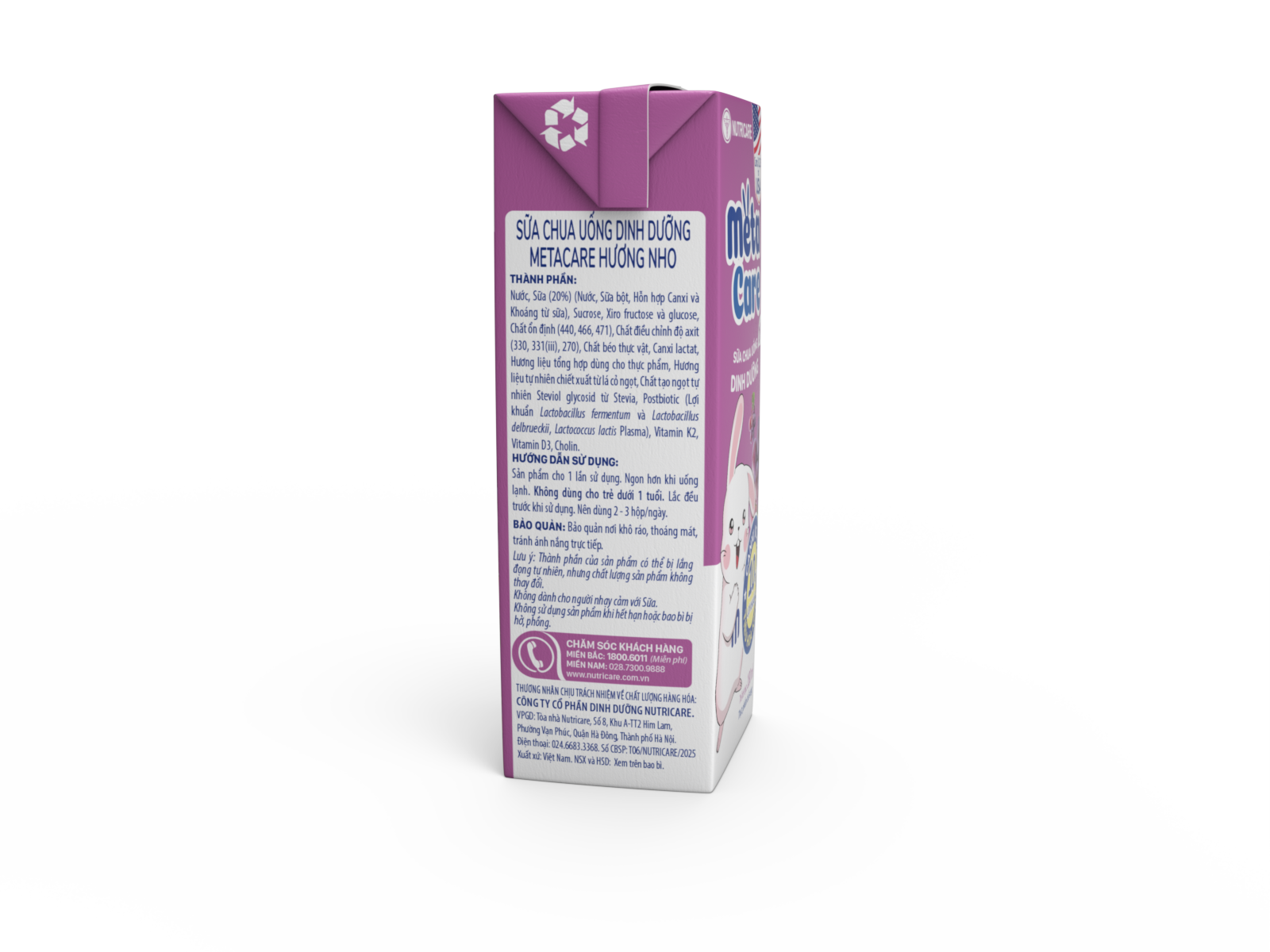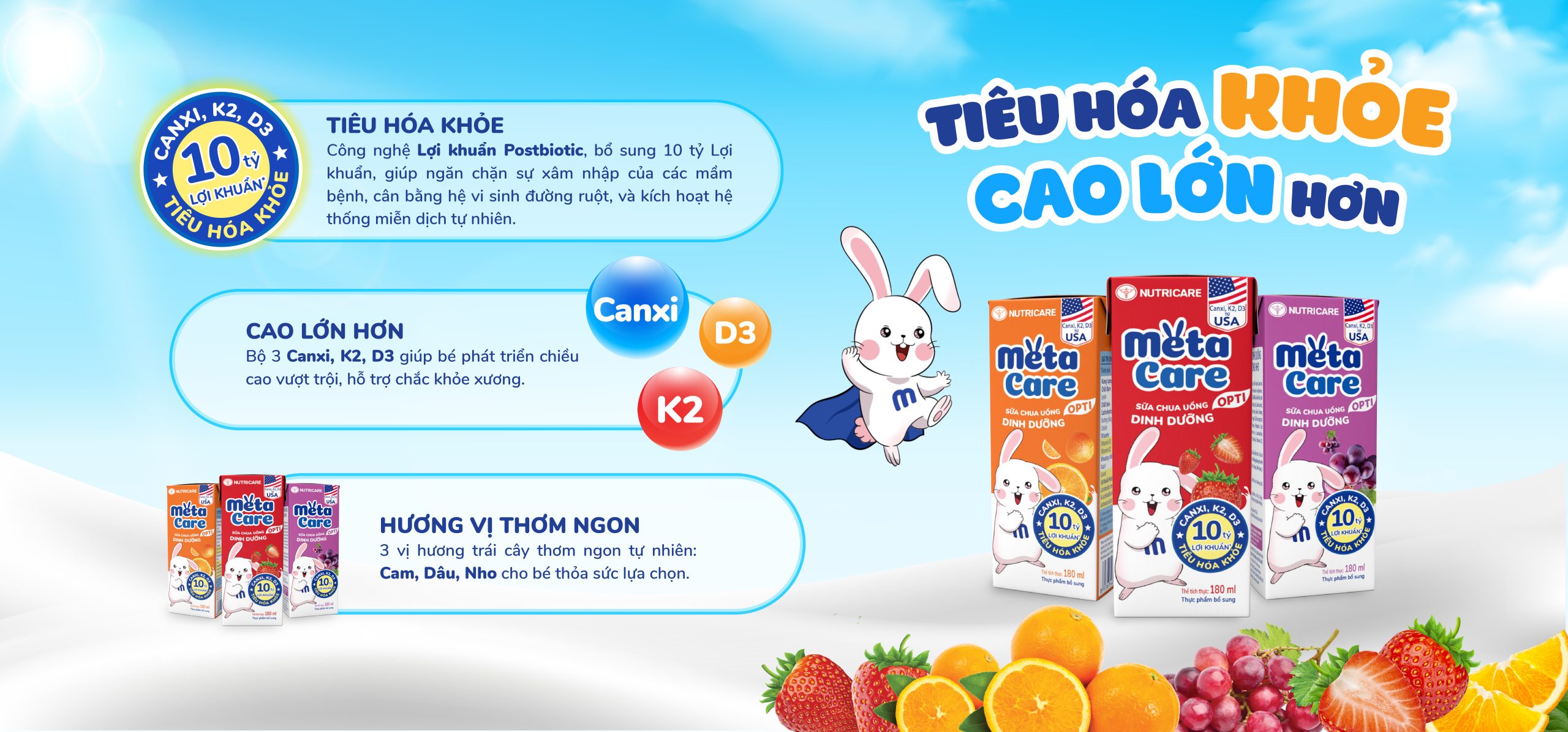 Sữa chua uống dinh dưỡng Metacare được phát triển bởi Viện Dinh dưỡng Y học Nutricare Hoa kỳ đột phá công nghệ Lợi khuẩn Postbiotic với 10 tỷ lợi khuẩn(*) cùng Canxi, K2, D3 giúp bé tiêu hóa khỏe, cao lớn hơn. 3 vị trái cây tự nhiên Cam, Dâu, Nho, bé thỏa sức khám phá và thưởng thức mỗi ngày.