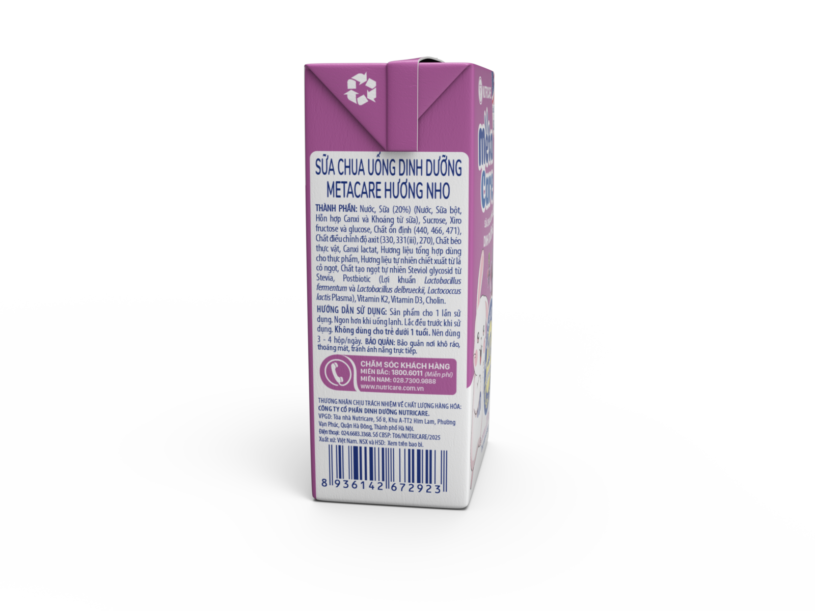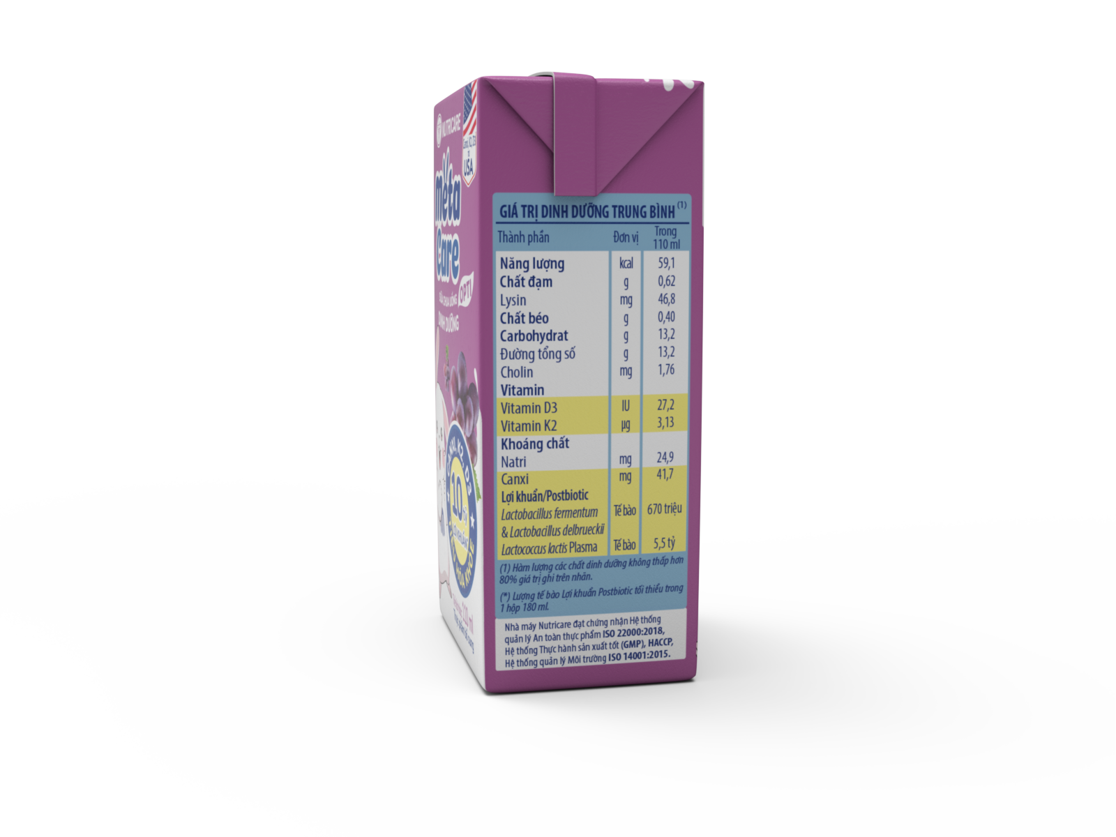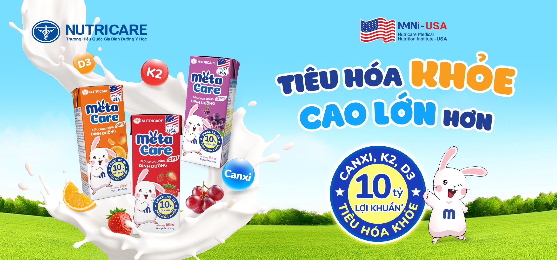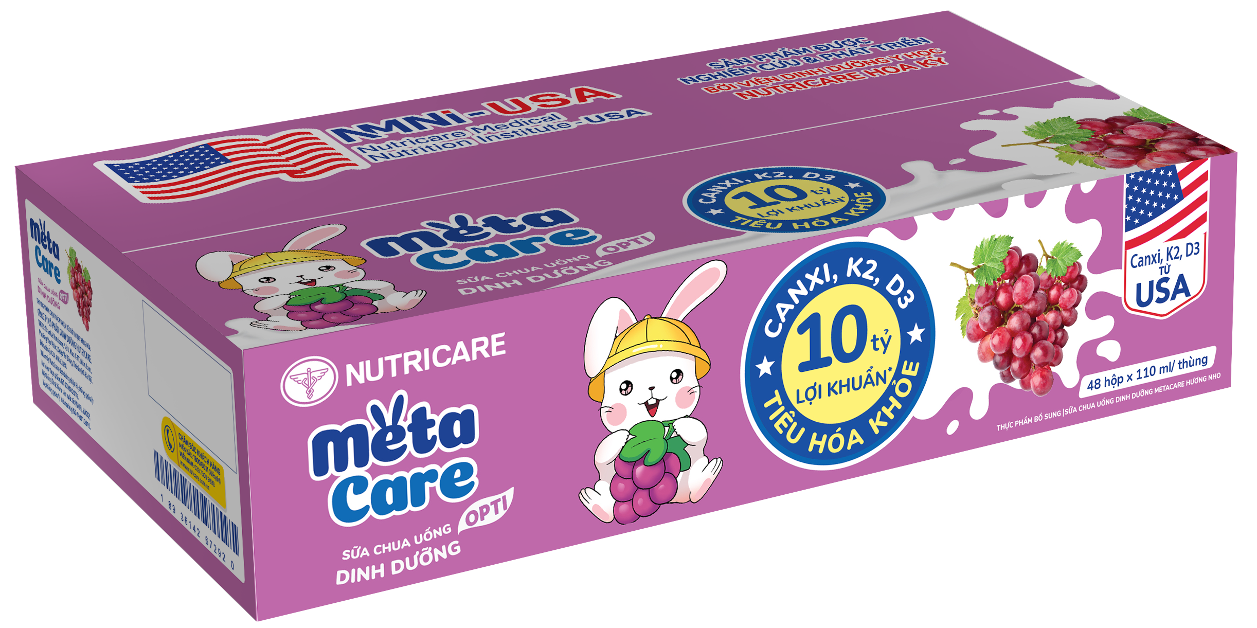 Sữa chua uống dinh dưỡng Metacare được phát triển bởi Viện Dinh dưỡng Y học Nutricare Hoa kỳ đột phá công nghệ Lợi khuẩn Postbiotic với 10 tỷ lợi khuẩn(*) cùng Canxi, K2, D3 giúp bé tiêu hóa khỏe, cao lớn hơn. 3 vị trái cây tự nhiên Cam, Dâu, Nho, bé thỏa sức khám phá và thưởng thức mỗi ngày.