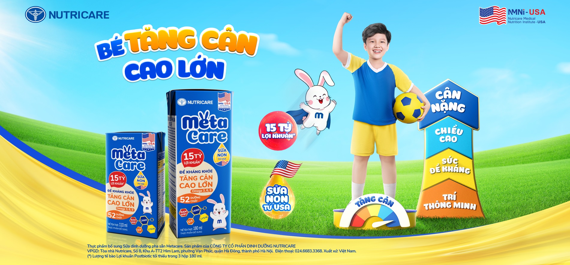 3 hộp Metacare mỗi ngày đáp ứng 100% nhu cầu Canxi(**) theo khuyến nghị của Tổ chức Y tế Thế giới (WHO). Kết hợp Phốt pho và Vitamin D3 giúp hấp thu Canxi tối ưu, hỗ trợ bé phát triển xương chắc khỏe và tăng chiều cao vượt trội.