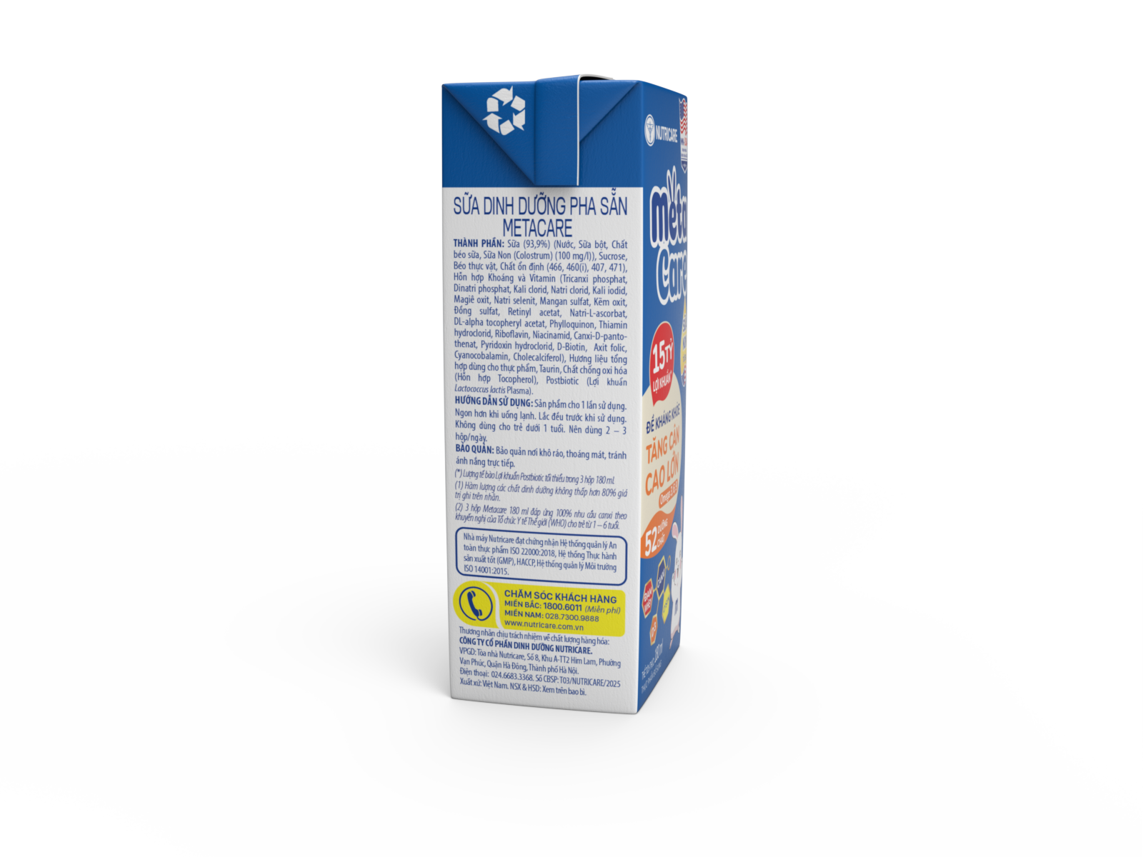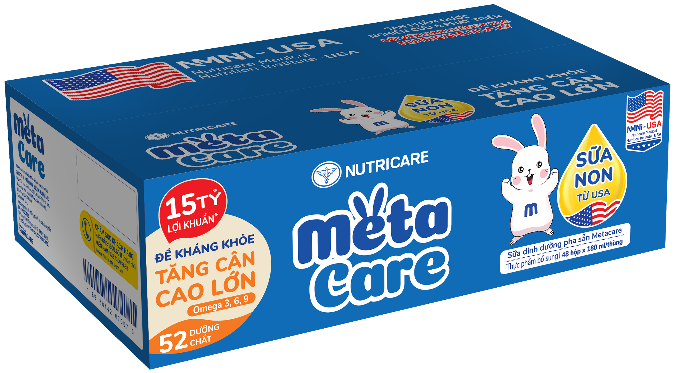 (**) 3 hộp Metacare 180 ml đáp ứng 100% nhu cầu Canxi theo khuyến nghị của Tổ chức Y tế Thế giới (WHO) cho trẻ từ 1 – 6 tuổi.