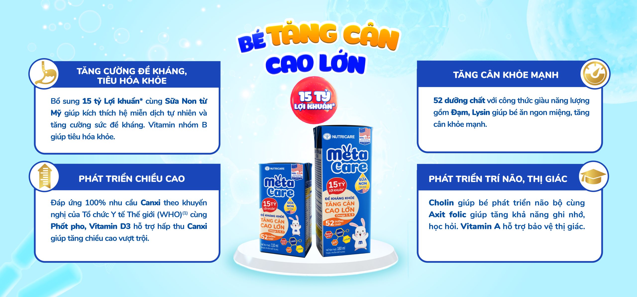 Metacare được phát triển bởi Viện Dinh dưỡng Y học Nutricare Hoa Kỳ, bổ sung 15 tỷ Lợi khuẩn Postbiotic(*) cùng Sữa non từ Mỹ và các dưỡng chất thiết yếu như Đạm, Lysin và Canxi giúp bé đề kháng khỏe, tăng cân cao lớn.