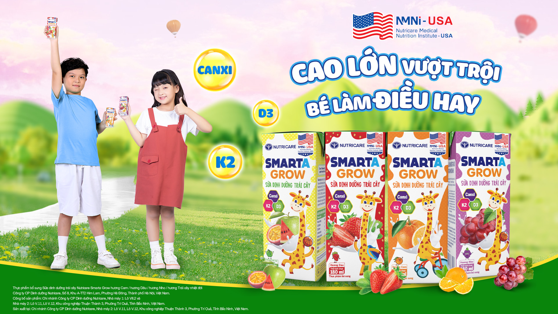 Sữa dinh dưỡng trái cây Nutricare Smarta Grow với bộ ba Canxi, K2, D3 giúp bé cao lớn vượt trội, xương chắc khỏe, cùng hương vị trái cây thơm ngon dễ uống mang lại năng lượng dồi dào, để bé khỏe mạnh, tự tin chinh phục nhiều điều hay trong học tập và khám phá.