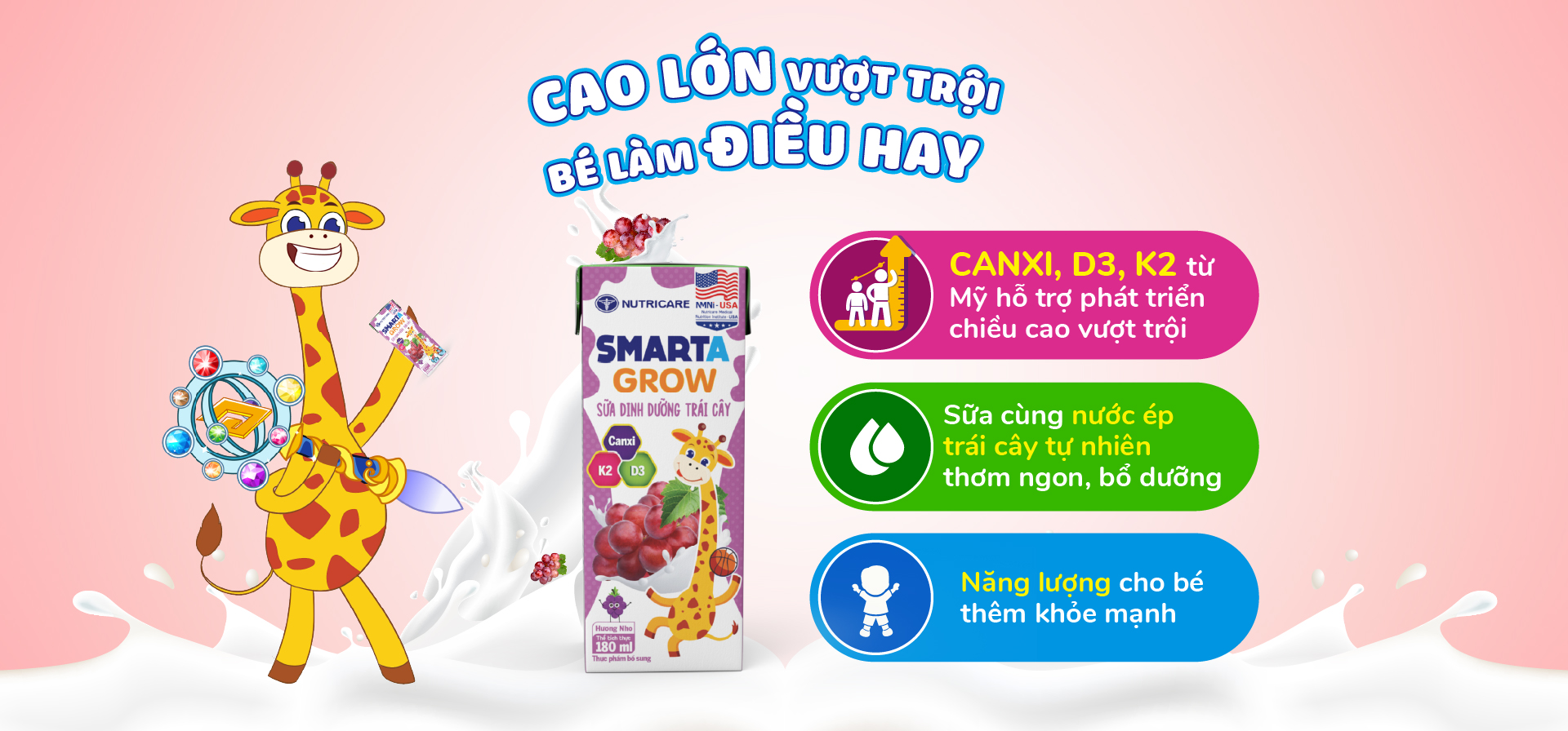 Sữa trái cây Nutricare Smarta Grow với bộ ba Canxi, K2, D3 giúp bé cao lớn vượt trội, xương chắc khỏe, cùng hương vị trái cây thơm ngon dễ uống mang lại năng lượng dồi dào, để bé khỏe mạnh, tự tin chinh phục nhiều điều hay trong học tập và khám phá.