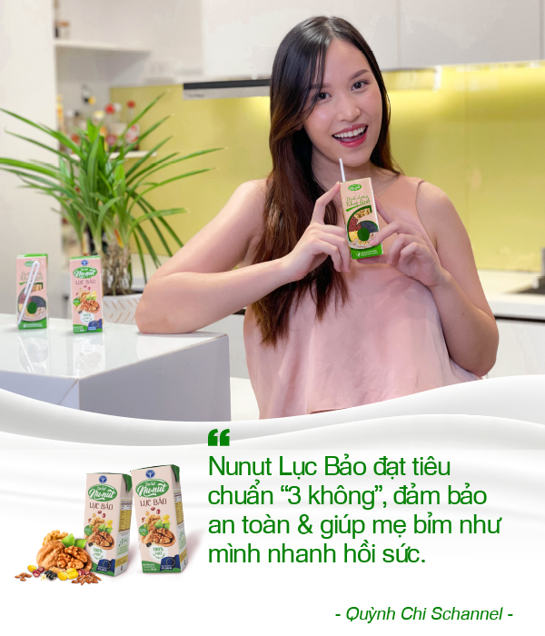 Quỳnh Chi chia sẻ, cô biết đến sữa hạt NuNut Lục Bảo rất tình cờ trong lúc đang tìm hiểu về chế độ ăn “heo thì” mà vẫn đủ chất cho mẹ bỉm. 6 loại hạt có trong sản phẩm theo như cô tìm hiểu thì rất tốt cho thể trạng của mẹ sau sinh. Hơn thế, sản phẩm còn đạt tiêu chuẩn 3 không: Không chất bảo quản, không màu tổng hợp, không chất tạo ngọt tổng hợp nên cô càng yên tâm hơn khi sử dụng.