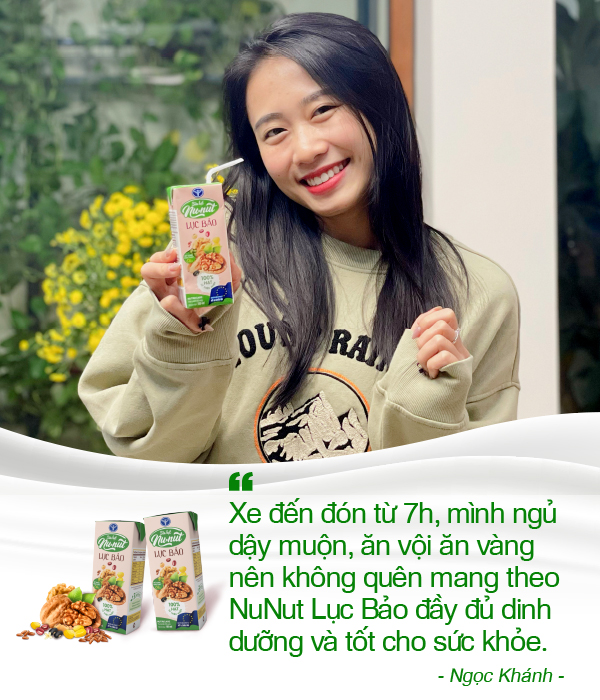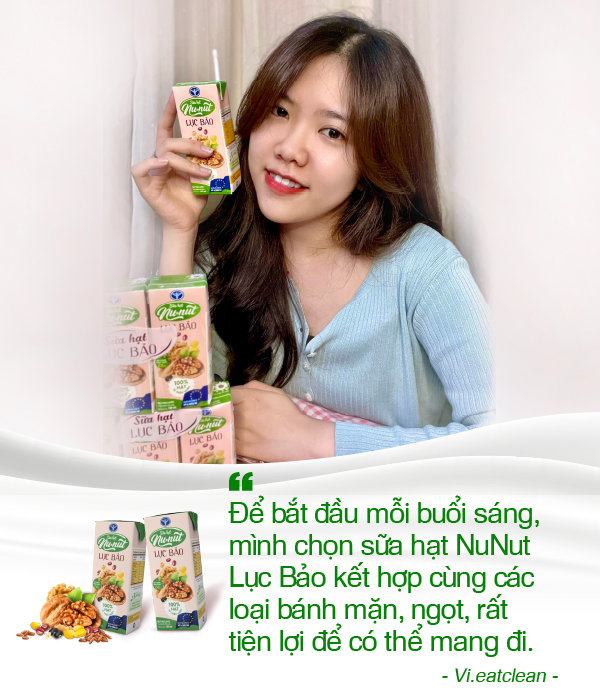 Giống như Hoàng Vi, cô nàng nữ sinh Bách Khoa xinh đẹp đam mê eat clean và lối sống lành mạnh Ngọc Khánh cũng dành lời khen cho NuNut Lục Bảo. Trong bữa tiệc độc thân cùng với hội bạn cùng “cảnh ngộ”, NuNut Lục Bảo là lựa chọn cho bữa sáng tiện lợi mà vẫn đủ chất của Ngọc Khánh khi cô phải di chuyển sớm từ Hà Nội tới Hạ Long (Quảng Ninh).