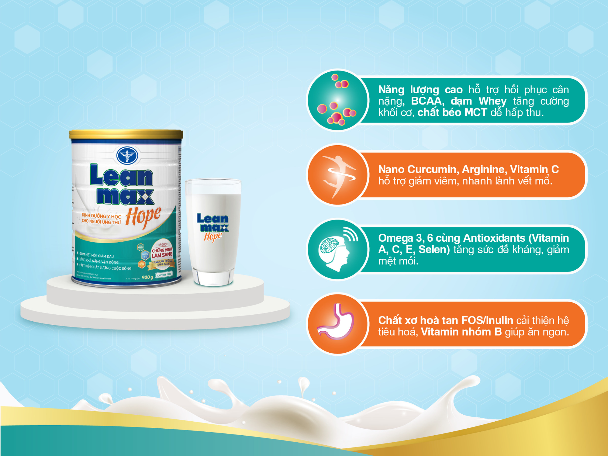 Leanmax Hope cung cấp nguồn dinh dưỡng giàu protein và các dưỡng chất dễ hấp thu như đạm whey, chất béo trung bình (MCT) giúp tăng cân, tăng cơ, cải thiện chất lượng cuộc sống cho người ung thư. Sản phẩm chứa Nano Curcumin, Arginine, Vitamin C hỗ trợ giảm viêm, nhanh lành vết mổ; Omega 3,6 cùng Antioxidants (Vitamin A, C, E & Selen) tăng sức đề kháng, giảm mệt mỏi; Chất xơ hòa tan FOS/Inulin, Vitamin nhóm B cải thiện tiêu hóa, giúp ăn ngon.