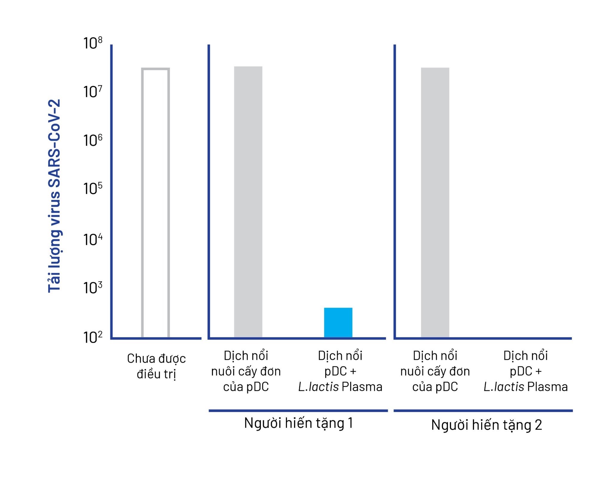 Trong một nghiên cứu in vitro, tế bào Vero đã bị nhiễm SARS-CoV-2 (biến thể WK-521) được sử dụng để kiểm tra tác dụng của lợi khuẩn Postbiotic L.Lactis Plasma trên tế bào miễn dịch (pDC). Kết quả cho thấy, các môi trường nuôi cấy có thêm lợi khuẩn Postbiotic L.Lactis Plasma có mức tăng sinh vi-rút thấp hơn đáng kể so với các môi trường không cho thêm. Điều này được minh chứng rõ ràng qua biểu đồ tải lượng vi-rút, nơi mà các mẫu có thêm lợi khuẩn Postbiotic L.Lactis Plasma (dịch nổi pDC + L. lactis Plasma) cho thấy sự giảm mạnh về tải lượng vi-rút SARS-CoV-2, so với các mẫu chỉ có dịch nổi nuôi cấy đơn của tế bào pDC hoặc không điều trị.