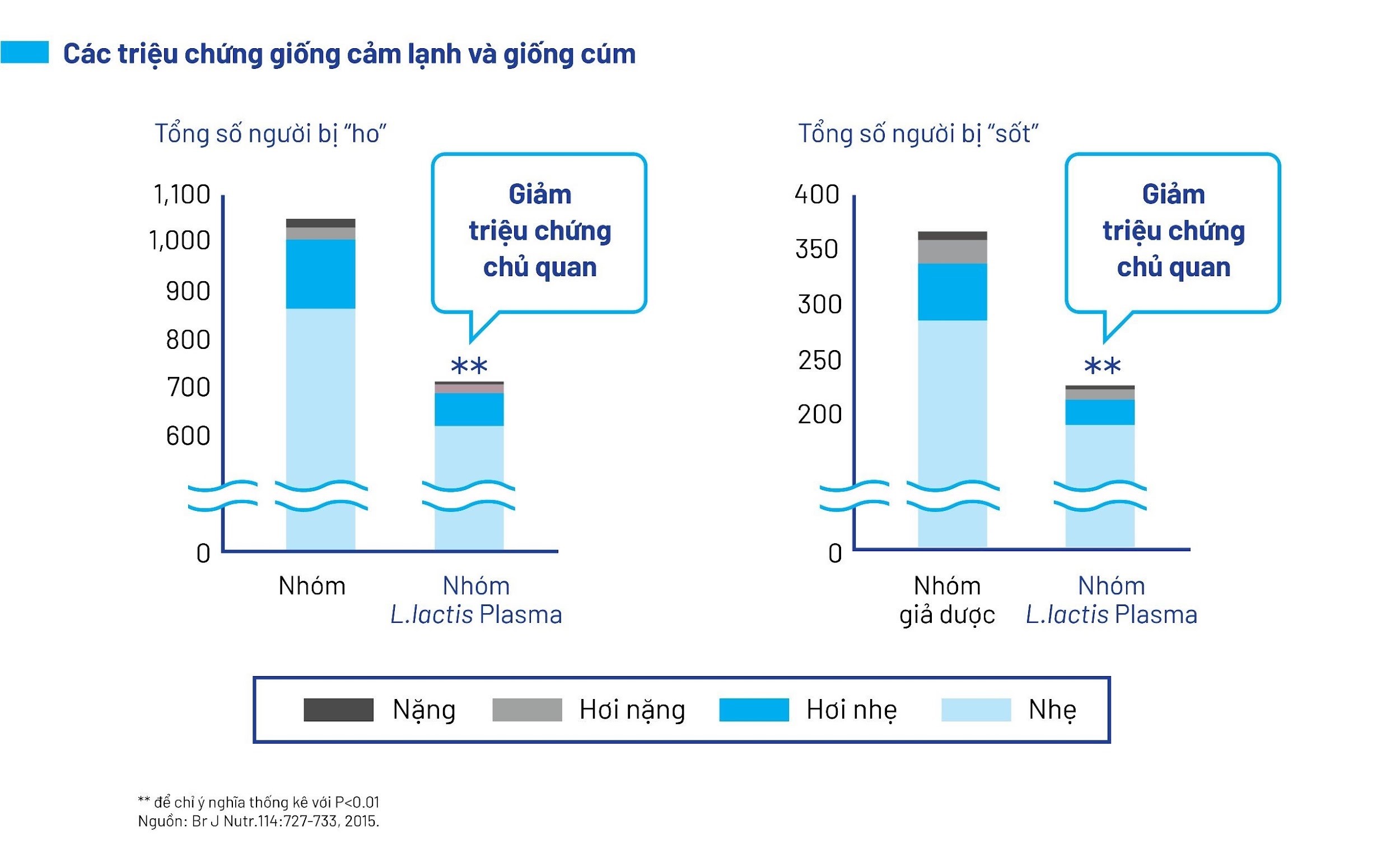 Sử dụng lợi khuẩn Postbiotic L.Lactis Plasma đã được chứng minh giúp giảm nguy cơ mắc các triệu chứng giống cảm lạnh và cúm. Trong các nghiên cứu, nhóm người sử dụng lợi khuẩn Postbiotic L.Lactis Plasma có sự giảm rõ rệt về các triệu chứng chủ quan như ho và sốt so với nhóm giả dược. Biểu đồ cho thấy, tổng số người bị “ho” và “sốt” trong nhóm sử dụng lợi khuẩn Postbiotic L.Lactis Plasma giảm đáng kể so với nhóm giả dược. Cụ thể, số người bị ho và sốt nặng, hơi nặng và nhẹ đều giảm ở nhóm sử dụng lợi khuẩn Postbiotic L.Lactis Plasma, điều này chứng minh khả năng của lợi khuẩn này trong việc giảm các triệu chứng cảm lạnh và cúm ở người lớn.
