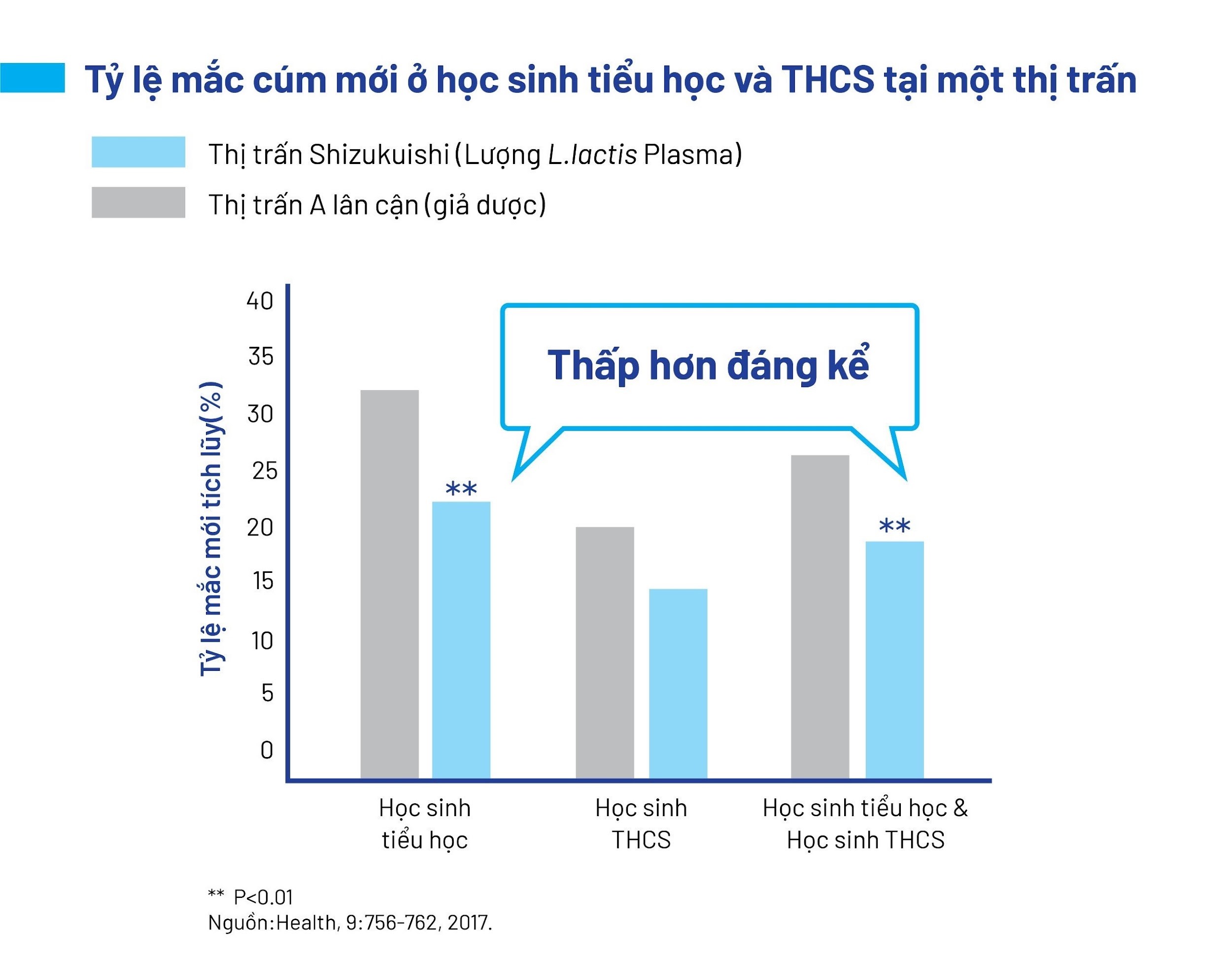 Lợi khuẩn Postbiotic L.Lactis Plasma cũng đã chứng minh hiệu quả trong việc giảm tỷ lệ mắc bệnh cúm tích lũy ở trẻ em. Tại thị trấn Shizukuishi, tỉnh Iwate, khi tất cả học sinh tiểu học và trung học cơ sở được cho sử dụng lợi khuẩn Postbiotic L.Lactis Plasma ba lần một tuần trong bữa trưa tại trường trong ba tháng, tỷ lệ mắc cúm mới tích lũy đã giảm so với Thị trấn A lân cận, nơi không sử dụng lợi khuẩn Postbiotic L.Lactis Plasma. Biểu đồ thể hiện rõ ràng rằng tỷ lệ mắc cúm mới tích lũy ở học sinh tiểu học và trung học cơ sở tại Shizukuishi thấp hơn đáng kể so với Thị trấn A, chứng tỏ hiệu quả phòng ngừa cúm của lợi khuẩn Postbiotic L.Lactis Plasma.