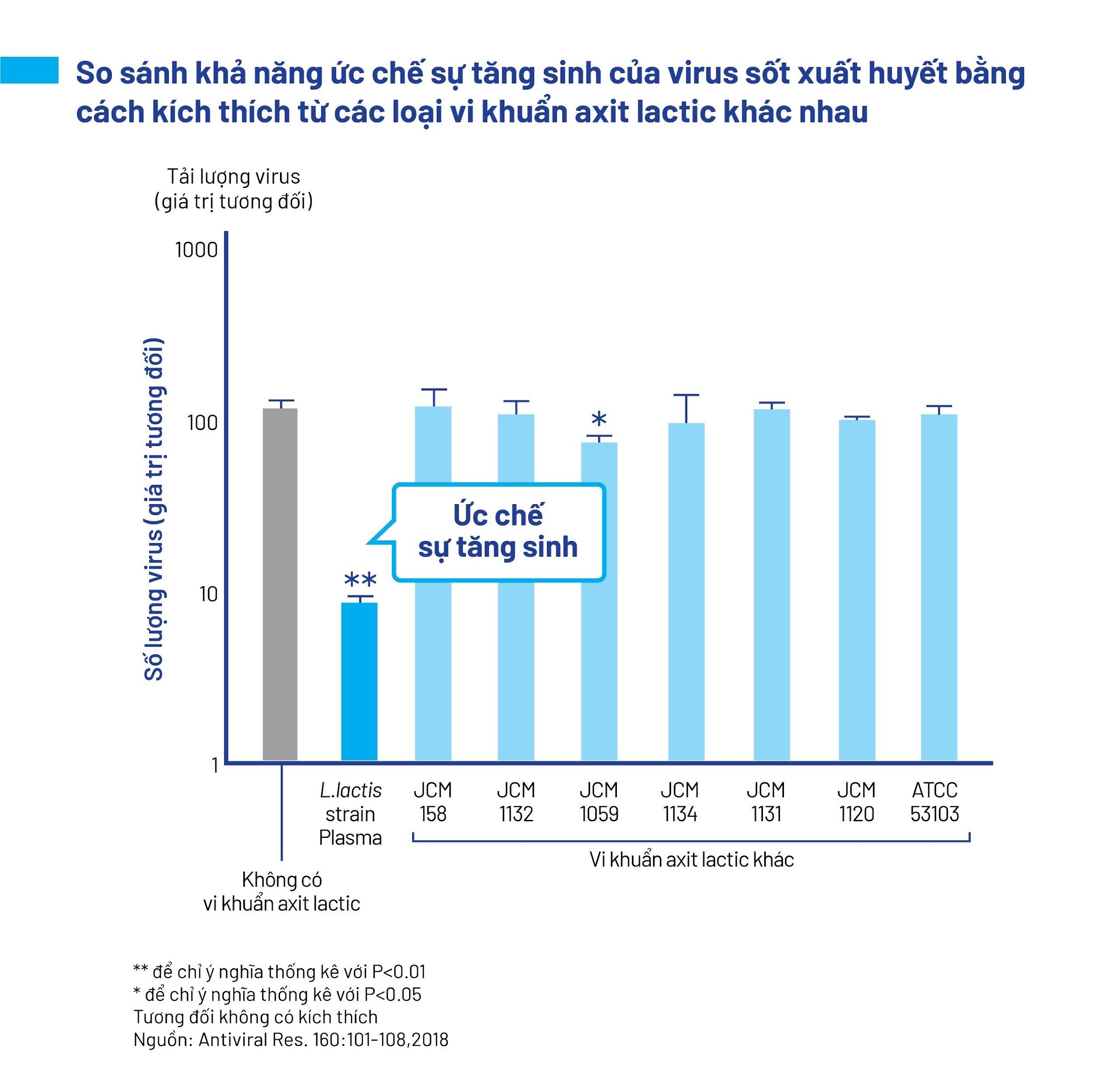 Các tế bào đuôi gai được kích thích bởi lợi khuẩn Postbiotic L.Lactis Plasma đã cho thấy tác dụng ức chế sự tăng sinh của vi-rút sốt xuất huyết. Biểu đồ so sánh khả năng ức chế sự tăng sinh của vi-rút sốt xuất huyết giữa các loại vi khuẩn axit lactic khác nhau cho thấy lợi khuẩn Postbiotic L.Lactis Plasma có hiệu quả ức chế cao nhất, với số lượng vi-rút giảm đáng kể so với các mẫu không sử dụng vi khuẩn axit lactic hoặc sử dụng các chủng vi khuẩn khác. Điều này khẳng định khả năng của lợi khuẩn Postbiotic L.Lactis Plasma trong việc ức chế sự phát triển của vi-rút sốt xuất huyết, mở ra hy vọng mới cho việc phòng ngừa và điều trị bệnh.