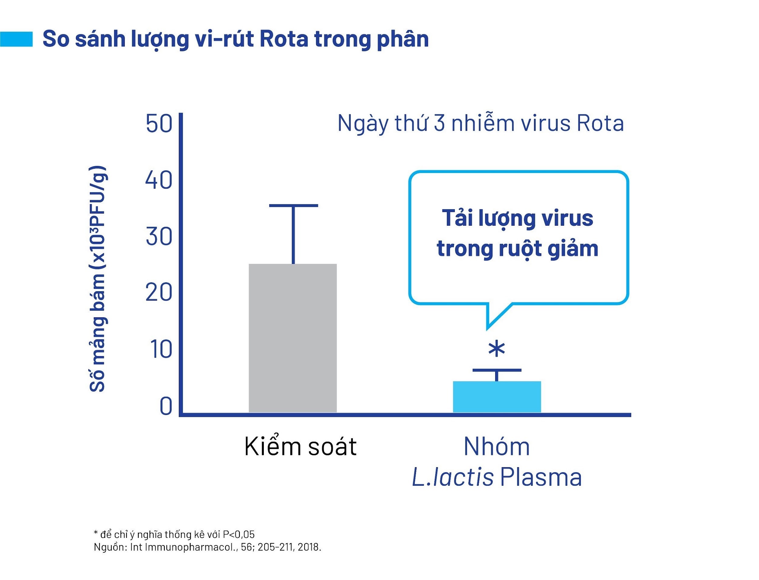 Một nghiên cứu phi lâm sàng đã chỉ ra rằng lợi khuẩn Postbiotic L.Lactis Plasma có tác dụng ức chế sự tăng sinh của vi-rút Rota trong ruột. Nghiên cứu này được thực hiện trên chuột, cho thấy rằng khi chuột được ăn lợi khuẩn Postbiotic L.Lactis Plasma, lượng vi-rút Rota trong phân của chúng giảm đáng kể so với nhóm kiểm soát không sử dụng lợi khuẩn này. Biểu đồ so sánh lượng vi-rút Rota trong phân giữa nhóm chuột kiểm soát và nhóm chuột ăn lợi khuẩn Postbiotic L.Lactis Plasma cho thấy sự khác biệt rõ rệt, với số lượng vi-rút trong ruột của nhóm sử dụng lợi khuẩn Postbiotic L.Lactis Plasma giảm mạnh.