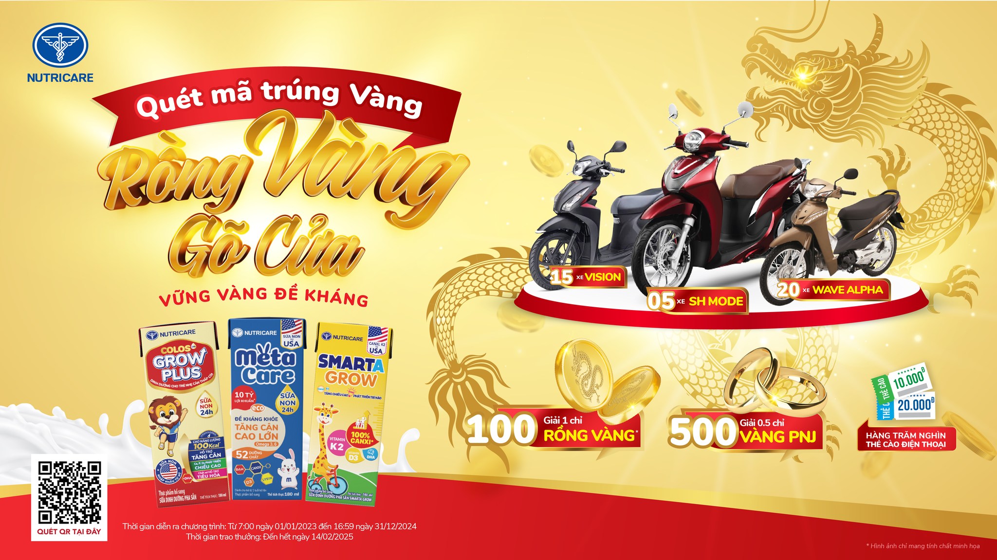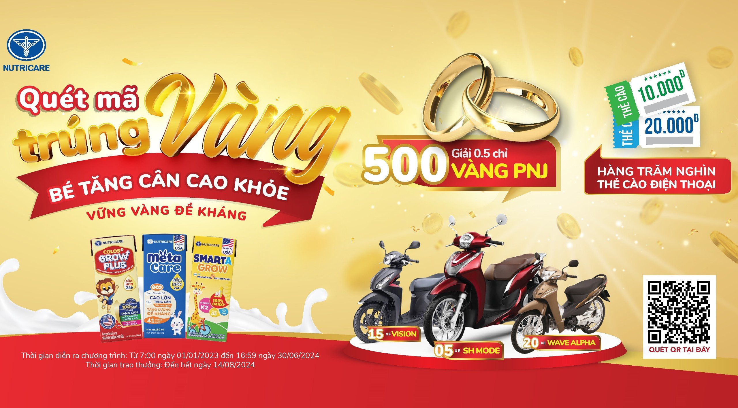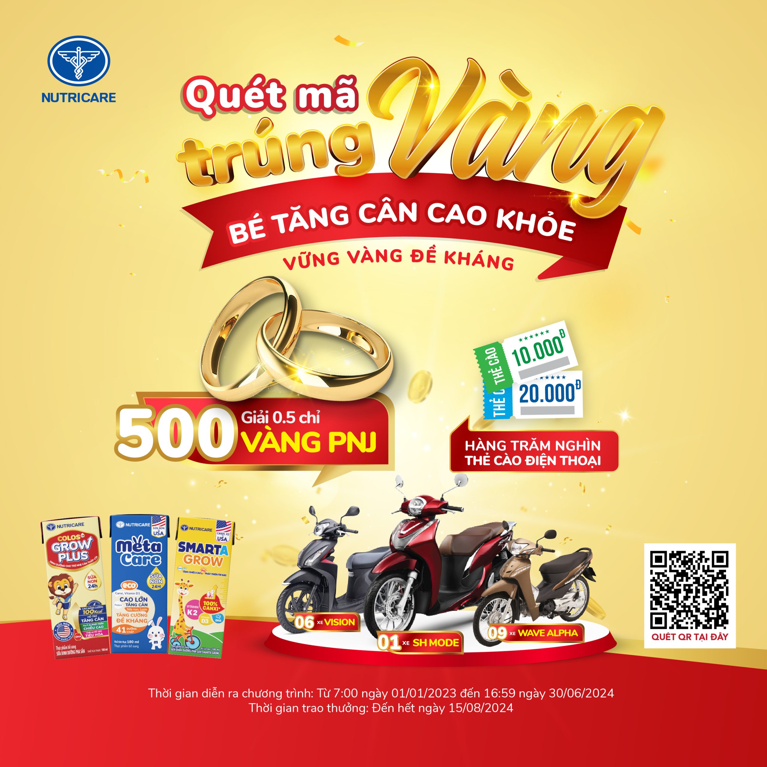 Tiếp nối sự thành công của chương trình “QUÉT MÃ TRÚNG VÀNG, VỮNG VÀNG ĐỀ KHÁNG”, Công ty Cổ phần Dinh dưỡng Nutricare tiếp tục dành tặng quý khách hàng cơ hội trúng ngay vàng cùng hàng hàng quà tặng có giá trị khác với chương trình khuyến mại “QUÉT MÃ TRÚNG VÀNG, BÉ TĂNG CÂN CAO KHỎE”