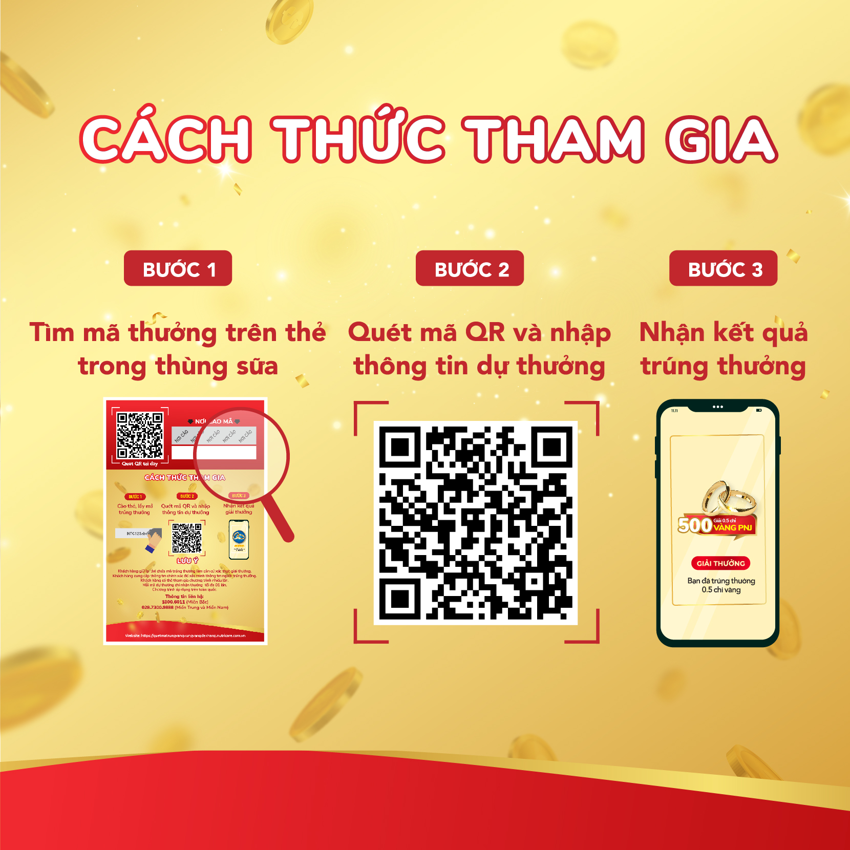 • Tìm thẻ cào trong mỗi thùng sữa nước, cào thẻ và lấy mã trúng thưởng.