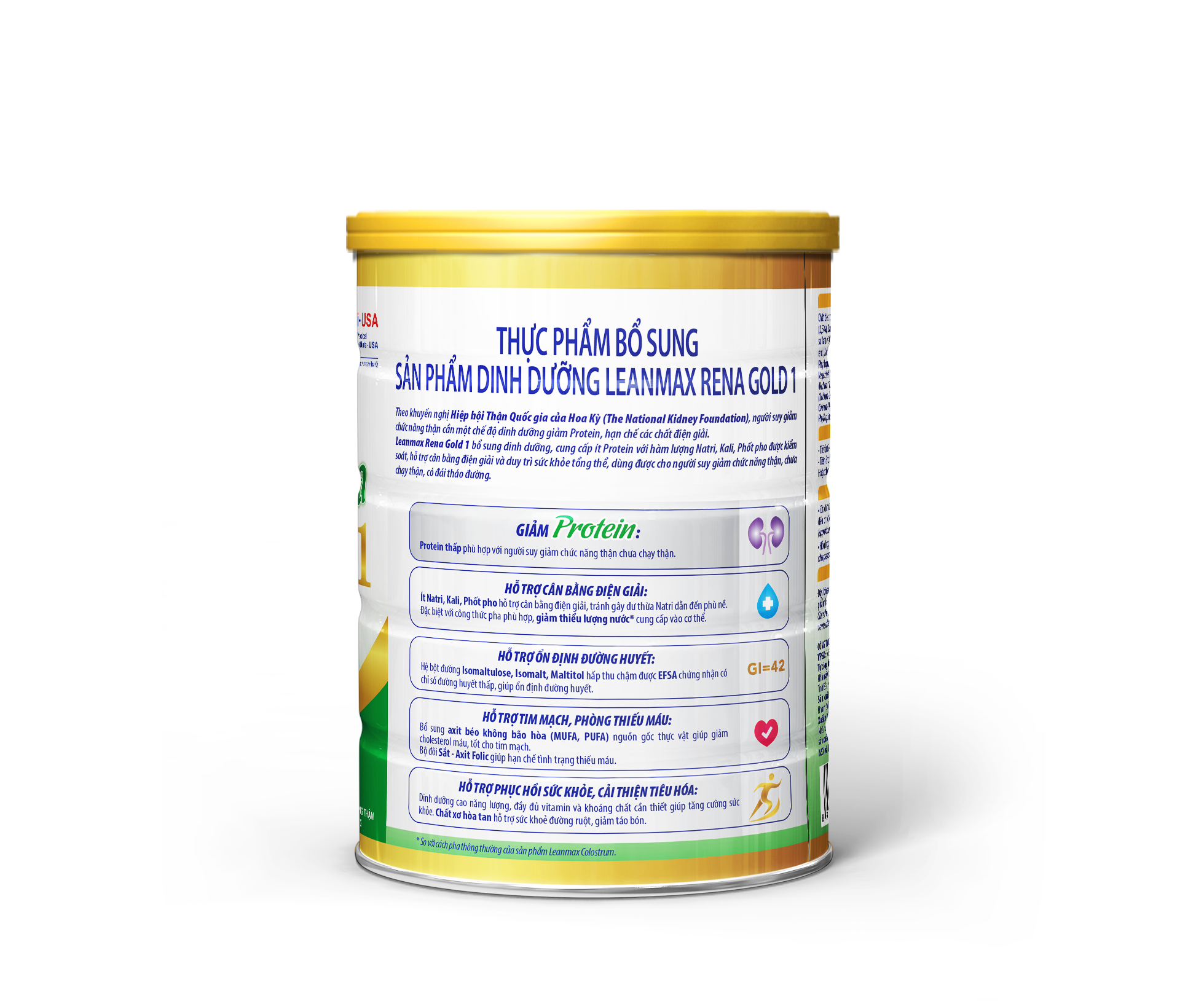 Leanmax Rena Gold 1 bổ sung dinh dưỡng, cung cấp ít Protein với hàm lượng Natri, Kali, Phốt pho được kiểm soát, hỗ trợ cân bằng điện giải và duy trì sức khỏe tổng thể, dùng được cho người suy giảm chức năng thận, chưa chạy thận, có đái tháo đường.