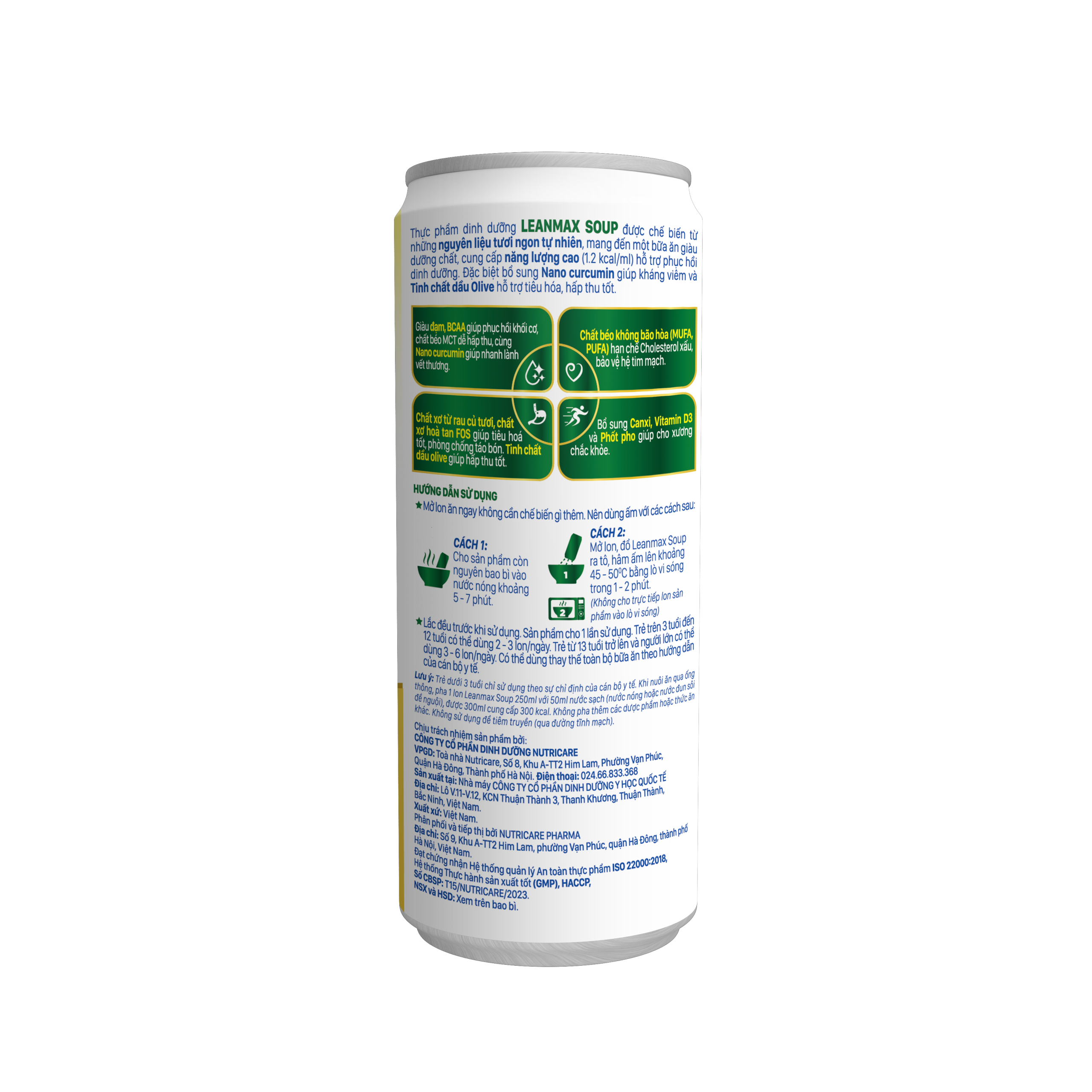 Thực phẩm dinh dưỡng Leanmax Soup được chế biến từ những nguyên liệu tươi ngon tự nhiên, mang đến một bữa ăn giàu dưỡng chất, cung cấp năng lượng cao (1.2 kcal/ml) hỗ trợ phục hồi dinh dưỡng. Đặc biệt bổ sung Nano curcumin giúp kháng viêm và Tinh chất dầu Olive hỗ trợ tiêu hóa, hấp thu tốt.