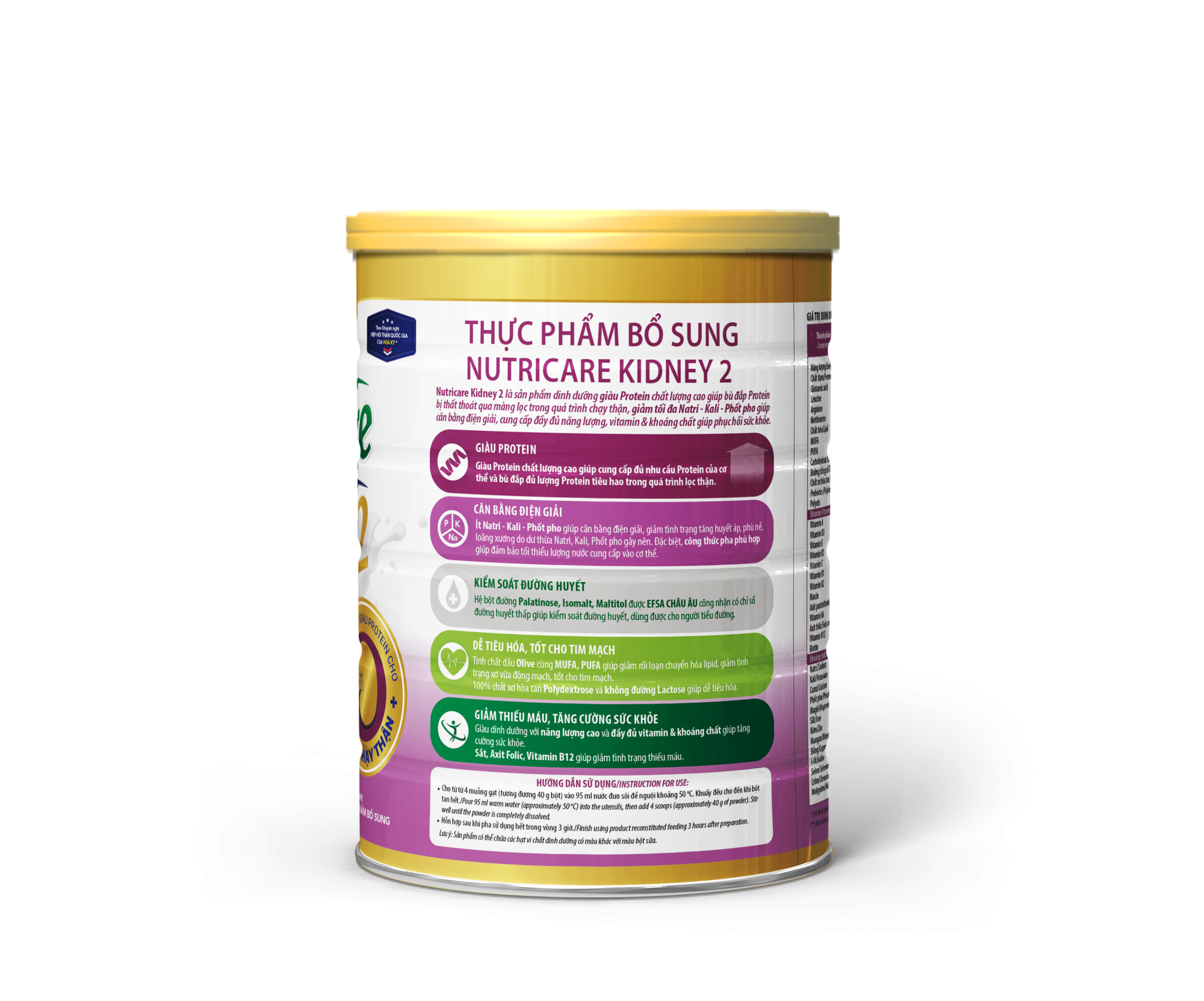 Ít Natri – Kali – Phốt pho giúp cân bằng điện giải, giảm tình trạng tăng huyết áp, phù nề, loãng xương do dư thừa Natri, Kali, Phốt pho gây nên. Đặc biệt, công thức pha phù hợp giúp đảm bảo tối thiểu lượng nước cung cấp vào cơ thể.