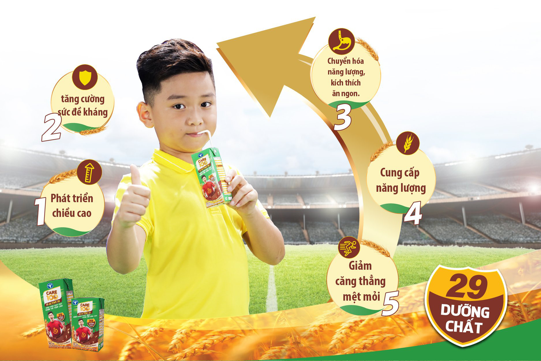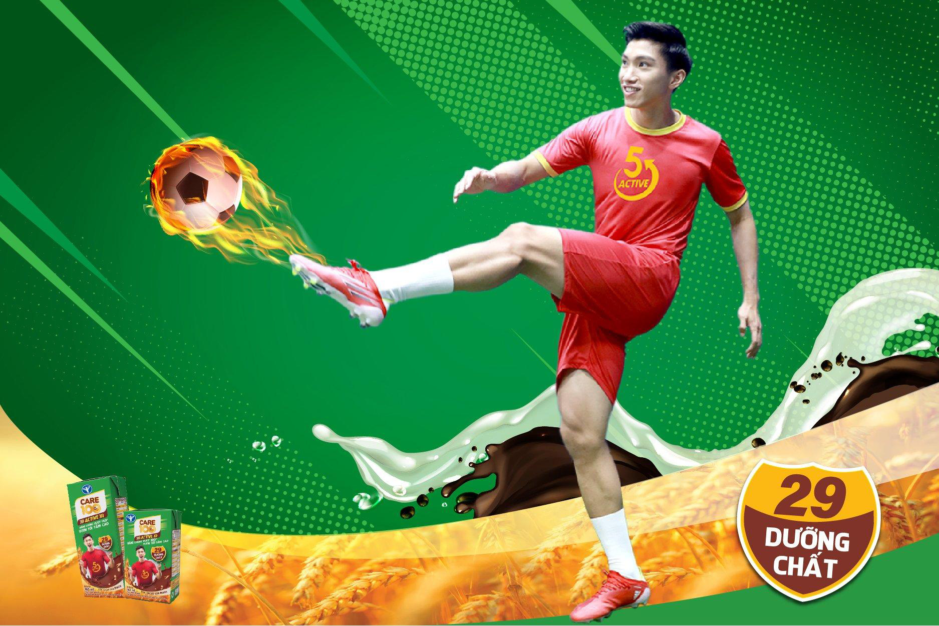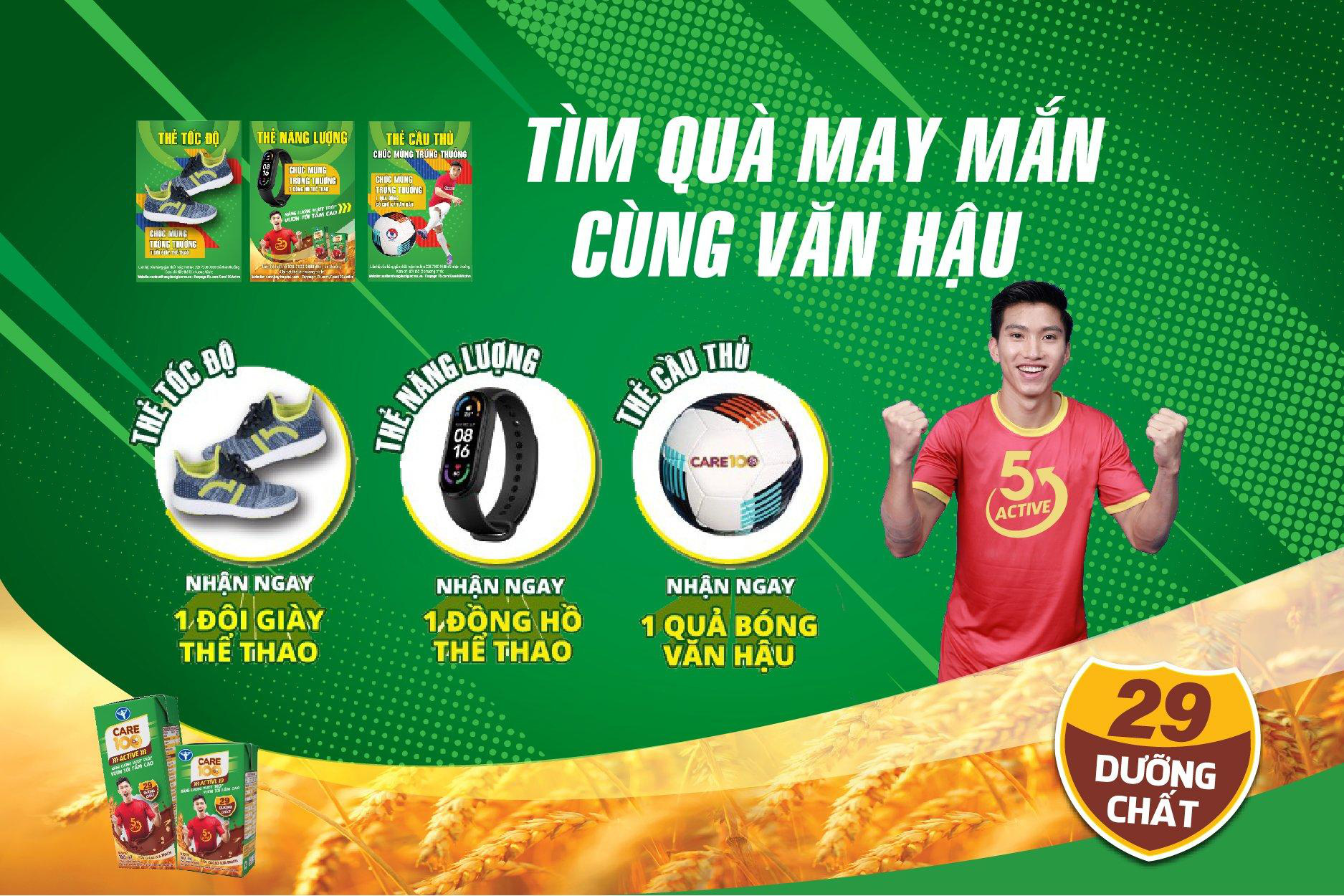 Được truyền cảm hứng từ cầu thủ trẻ tuổi Đoàn Văn Hậu, nhãn hàng Care 100 đã tổ chức chương trình đặc biệt dành cho các bạn nhỏ thông qua sản phẩm sữa cacao lúa mạch Care 100 Active mang tên: “Dẫn đầu cùng Văn Hậu: Săn bàn thắng – Đuổi giấc mơ”.