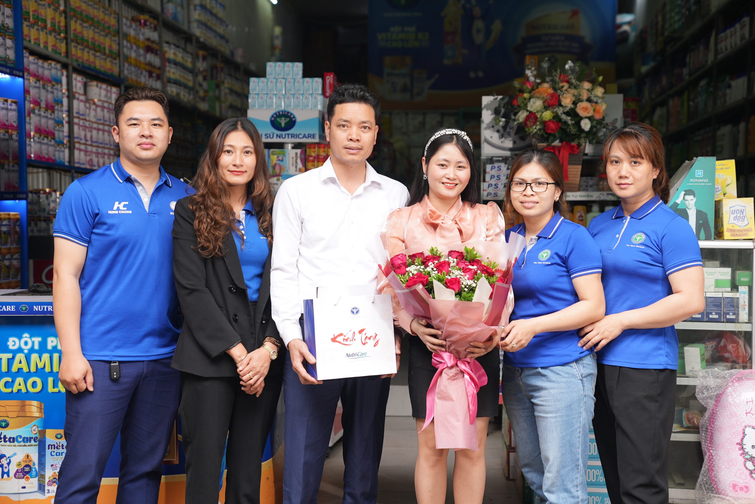 Anh Thường (áo trắng), chị Hà (cầm hoa) cùng đội ngũ nhân viên của Nutricare tại khu vực Hải Dương